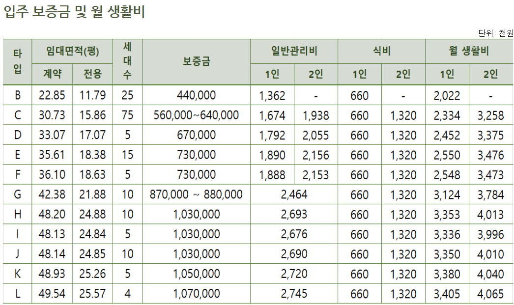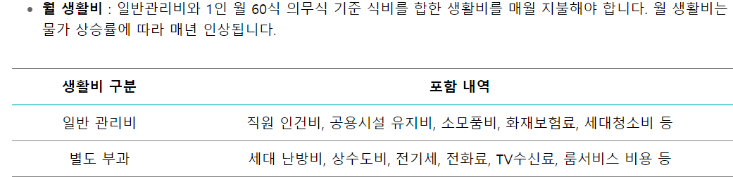월 생활비는 일반관리비와 식비(1인 월 60식 기준)를 포함합니다. 일반관리비 항목에는 직원 인건비, 공용시설 유지비, 소모품비, 화재보험료, 세대청소비 등이 포함되며, 세대 난방비, 상하수도비, 전기세, 전화료, TV수신료, 룸서비스 비용 등은 별도로 부과됩니다.