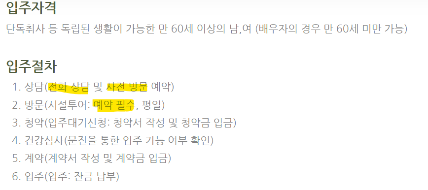 계약은 4년 단위로 재계약이 이루어지며, 전세보증금과 월생활비를 납부해야 합니다. 입주 보증금은 최소 거주기간 2년 이후 이주 시 전액 반환됩니다. 입주 준비물로는 도장과 신분증이 필요하며, 너싱홈의 경우 의사진단서, 전염성 질환 관련 진단서, 주민등록등본 등이 필요합니다.