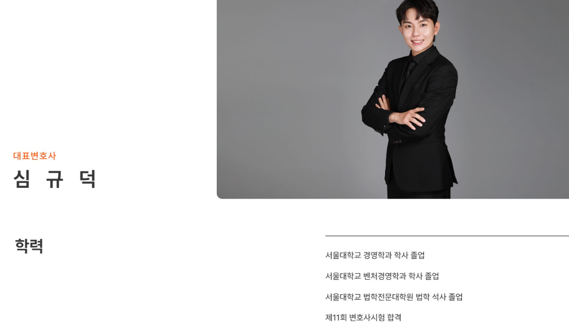 심규덕 변호사는 서울대학교 경영학과와 법학전문대학원을 졸업한 후 여러 법률 분야에서 경력을 쌓으며, 탄탄한 법률 지식을 바탕으로 클라이언트들에게 신뢰를 얻고 있습니다. 그의 법무법인은 복잡한 이혼 소송이나 재산 분할 등 민감한 문제들을 신속하고 공정하게 처리하는 것으로 명성이 높습니다.