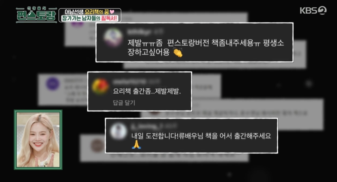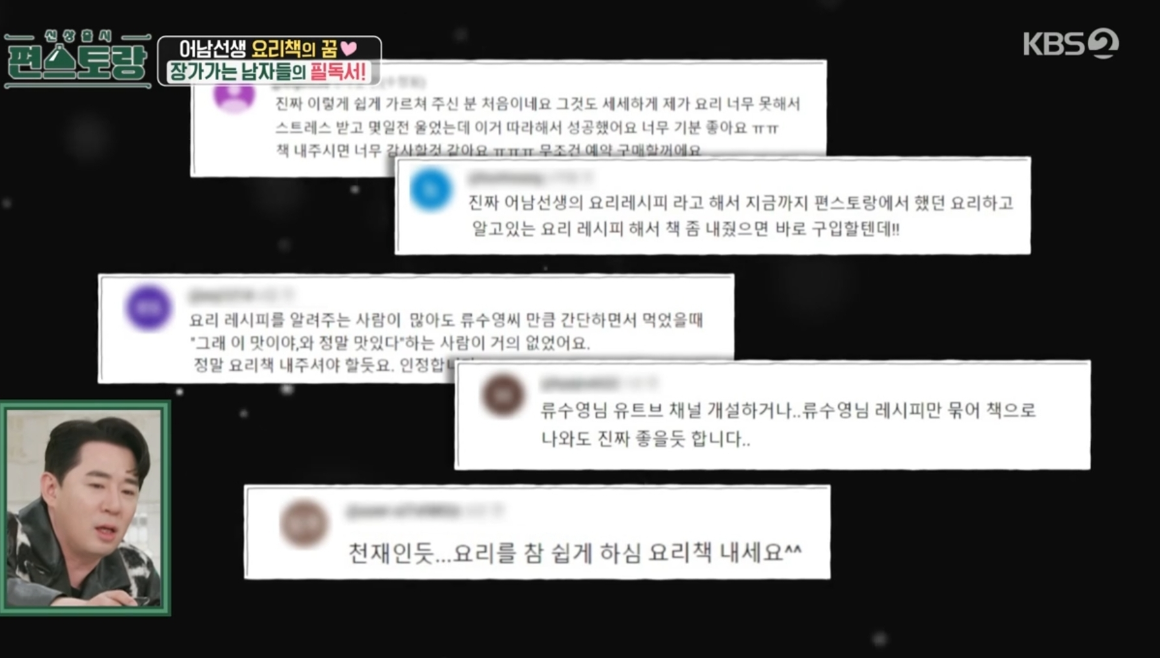 이를 계기로 '1가구 1수영 보급 시급'이라는 말이 생길 정도로 많은 여성 시청자들에게 큰 지지를 받고 있어요. 류수영님은 요리를 통해 남편분들도 부엌에 들어와 요리를 할 수 있도록 독려하고 있어요. 류수영님이 출연한 '편스토랑'에서는 그의 요리가 신상으로 출시되기도 했어요. 19대 치치닭, 26대 또치닭, 30대 참간초면, 31대 허니연유떡볶이, 35대 사치닭, 40대 마치닭, 44대 로제부대찌개 등이 편의점과 온라인 마켓에서 판매되었어요.