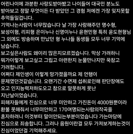 수면제를 장기간 복용해 판단력 저하와 인지능력 저하를 겪었고, 참으로 못난 지난 날들이었다"며, "피해자분들께 진심으로 미안한 마음을 전하며, 가진 돈이 4천원 밖에 없어서 환불해드리지 못해 너무 죄송하고, 170명을 위한 곡을 혼자 쓰는 것도 말도 안 되는 것이었다. 가는 마당에 진심으로 죄송하다. 그러나 음원이라는 것을 모두 가져보게 하는 마음은 진심이었다는 걸 기억해주세요."라고 밝혔습니다.