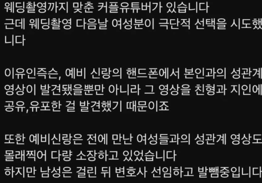 이 충격적인 발견 이후 여성 유튜버는 결혼식을 두 달 앞두고 극단적인 선택을 시도하기에 이릅니다. 그만큼 그녀에게 이 사건은 큰 충격이었으며, 심리적으로도 큰 타격을 입혔습니다. 더군다나 예비신랑의 휴대폰에는 전 여자친구들의 영상까지 있었다는 사실이 밝혀지면서 상황은 더욱 심각해졌습니다.