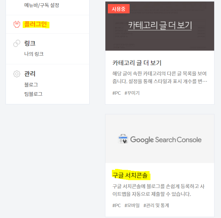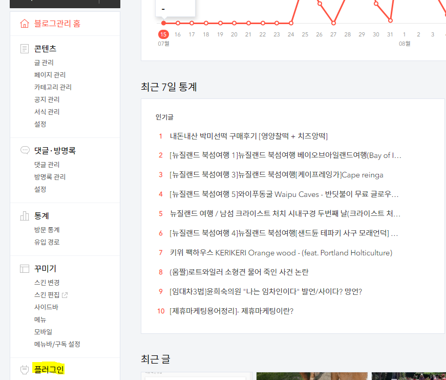 일단 티스토리 관리에 플러그인으로 들어가줍니다. (티스토리 플러그인을 잘 못찾으시겠다면, 글관리/카테고리 관리등이 있는 왼쪽목록을 주시하고 밑으로 내려주시면 바로 플러그인이 나옵니다.