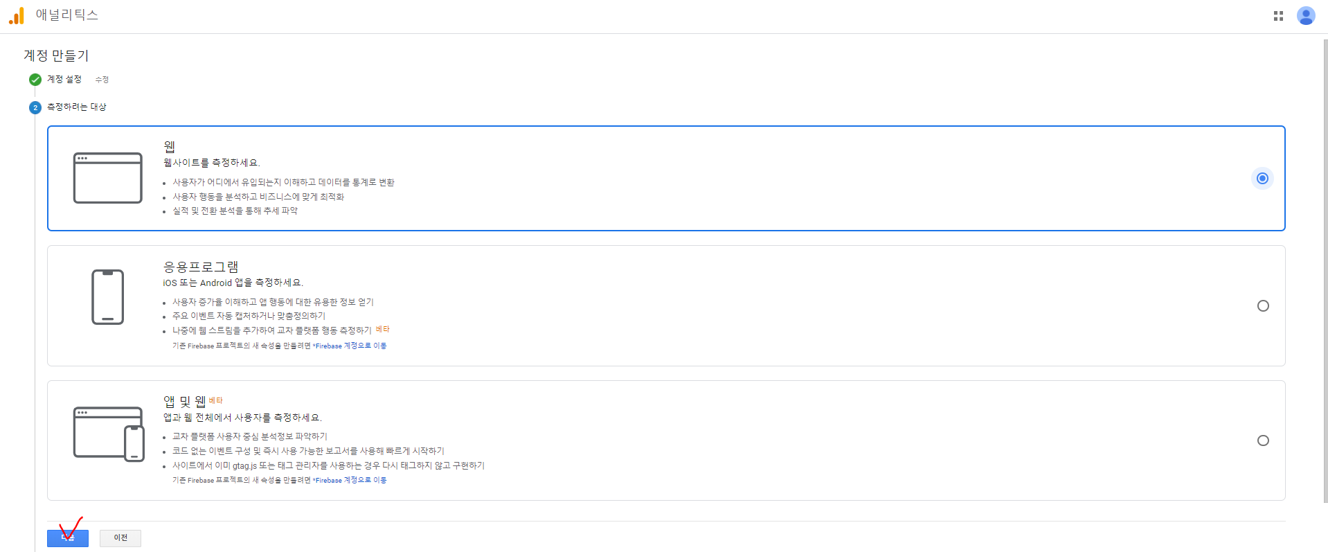 제가 측정하려는 대상은 일단 웹이지만, 구독해주시는 분께서 만약 어플리케이션이나 핸드폰을 이용하여 들어오는 고객들의 통계가 궁금하다고 여겨지시면 응용프로그램을, 둘다를 원하시면 앱 및 웹을 선택하시면 됩니다.