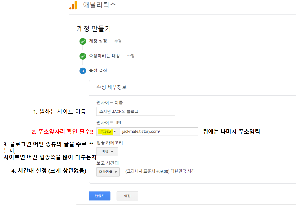 계정 이름은 원하시는 이름을 해주셔도 되지만, 분석하고자 하시려는 티스토리블로그의 이름이나, 웹사이트의 이름 등으로 해주시면 되겠습니다. 저는 jackmate로 한번 해보겠습니다.