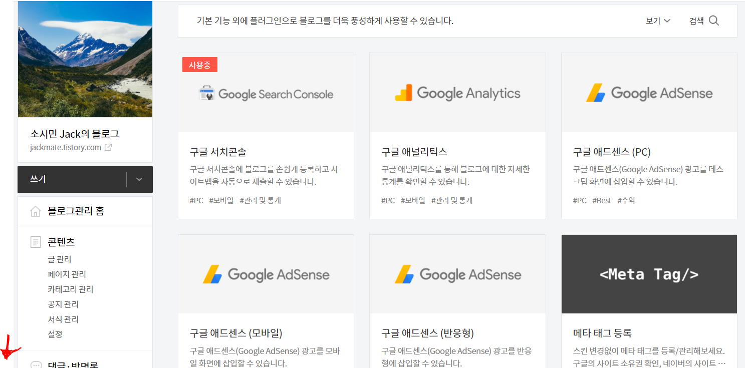그럼 저희는 마무리를 하러 다시 티스토리로 돌아가서 밑으로 내려서 플러그인을 확인해보도록 하겠습니다.
