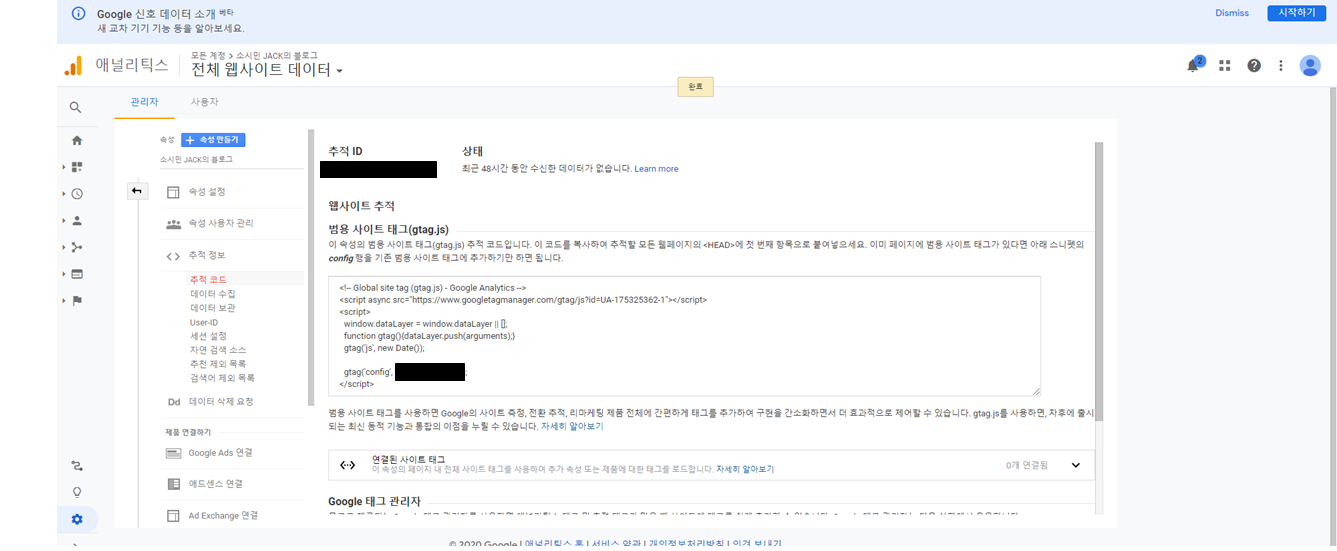 여기에 가려놓은 추적ID까지 나왔다면, 이제 애널리스틱스 연동이 거의 끝났다고 보시면 됩니다!