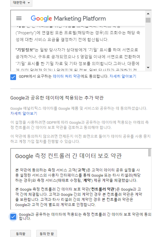 체크 체크 해주시고, 동의해주시면 됩니다. 여기서도 마찬가지로 대한민국으로 설정하셔도 되고 위치하고 계신 국가로 설정하셔도 좋습니다. 동의하면?