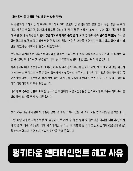 주비트레인은 "펑키타운은 3월 22일 업계 관계자를 통해 제가 주변 DJ나 뮤지션들과 함께 상습적으로 대마초를 흡연하고 있다는 소식을 접했다며 해고 사유를 주장했다"고 전했습니다. 또한, 회식 자리에서 자신이 '대마를 흡연하기 위해 산다'고 발언했다는 이야기를 들었다는 이유로 해고 통보를 받았다고 했습니다.