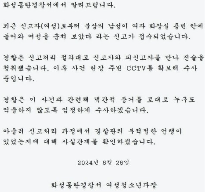 또 다른 문제점으로 지적된 건 수사 절차예요. 보통은 피의자로 지목된 사람에게 먼저 연락해 출석을 요구하고, 조사 일정을 잡는 게 일반적인 절차라고 해요. 그런데 이번엔 그런 과정 없이 곧바로 A씨의 집으로 찾아갔다는 거죠. 이런 논란이 커지자 화성동탄경찰서에서도 입장문을 냈어요. "객관적 증거를 토대로 누구도 억울하지 않도록 엄정하게 수사하겠다"며 "신고 처리 과정에서 경찰관의 부적절한 언행이 있었는지에 대해 사실관계를 확인하겠다"고 밝혔죠.