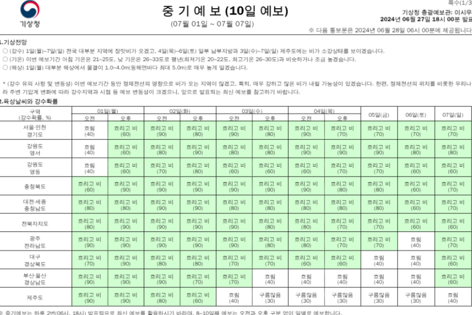 - 기타 대비책: 폭우가 심할 경우 외출을 자제하고, 비옷이나 방수복, 우산 등을 미리 준비해 두세요. 농사를 지으시는 분들은 장마철에 특히 예민해질 수 있지만, 필요한 대비를 철저히 하면 피해를 줄일 수 있습니다.