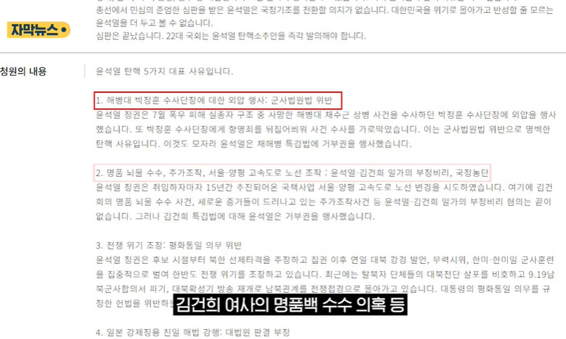 청원자는 이번 탄핵소추안을 발의한 배경에 대해 여러 가지 이유를 들었습니다. 가장 주목할 만한 이유는 해병대 채 상병 순직 사건 수사 외압 의혹과 김건희 여사의 명품백 수수 및 주가조작 의혹 등 다양한 법률 위반 혐의를 포함하고 있습니다. 이러한 여러 이유들이 국민들의 공분을 사며 탄핵 청원의 동력으로 작용하게 되었죠.