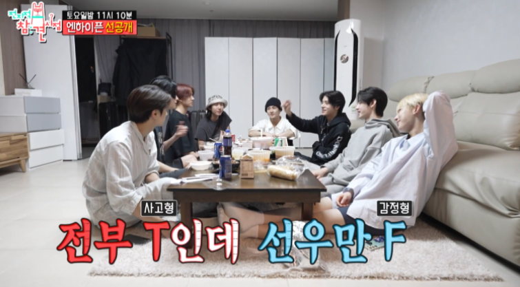 야식을 즐기던 중 멤버들의 MBTI 이야기가 나왔는데요, 엔하이픈의 MBTI는 팬들에게도 큰 관심사입니다. 멤버별 MBTI는 다음과 같습니다: 정원, 성훈, 제이크는 ISTJ, 희승과 제이는 INTP, 선우는 ESFJ, 니키는 ENTJ로 알려져 있습니다. 이 중에서 유일하게 F(감성파)를 가진 멤버가 바로 선우입니다. 나머지 멤버들은 모두 T(이성파)라서 선우가 혼자서 고군분투하는 모습이 귀엽게 다가왔어요.