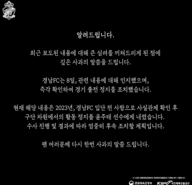 구단 측은 윤주태의 관련 혐의를 지난 8일 인지하고 즉각적인 확인 절차를 거쳐 출전 정지 조치를 내렸습니다. 이번 사건은 윤주태가 경남FC에 입단하기 전의 일로 밝혀졌으며, 구단은 사실 관계를 확인한 후 자체적으로 활동 정지를 결정했습니다. 경남FC는 수사 진행 및 결과에 따라 엄중한 후속 조치를 취할 계획이라고 밝혔습니다.