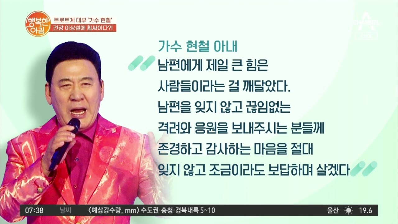 이 시기는 현철님이 트로트 4대 천왕 중 한 명으로 자리 잡는 계기가 되었습니다. 현철님은 2018년 이후로 건강 문제로 인해 무대에 서는 일이 줄어들기 시작했습니다. 2020년에는 뇌경색으로 투병 중이라는 사실이 밝혀졌고, 그로 인해 오랜 기간 병상에서 생활하셨습니다. 특히, 2022년 송해님이 별세했을 때 조문을 가지 못할 정도로 병세가 심각하셨습니다. 현철님은 경추 디스크 수술 후 신경 손상으로 인해 건강이 악화되었고, 그로 인해 오랜 기간 동안 투병 생활을 이어가셨습니다. 2018년 KBS '가요무대'에 출연하셨을 때는 힘들어하는 모습이 많은 팬들의 걱정을 샀습니다. 또한, 2023년에는 치매 증상까지 겹쳐 투병 중이라는 소식이 전해졌습니다.