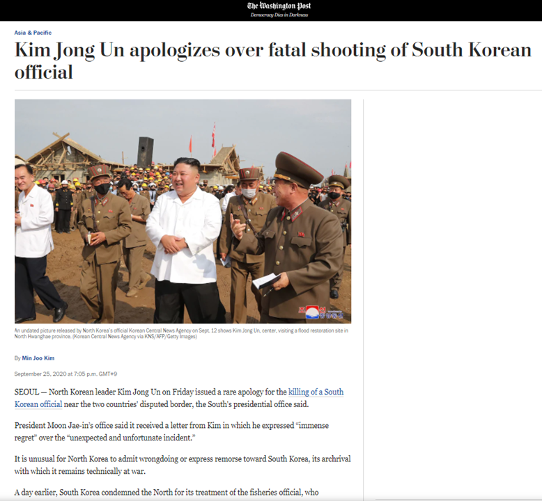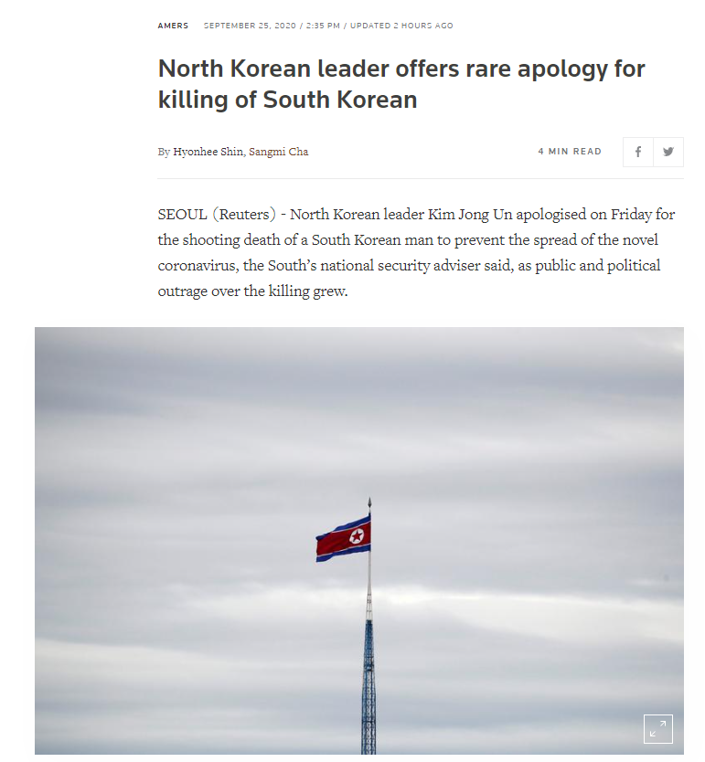 외신들은 일제히 9월 25일 북한의 대한민국 공무원 피살사건에 대한 김정은 북한 국무위원장의 사과를 속보로 상세하게 다루며 보도하였습니다.