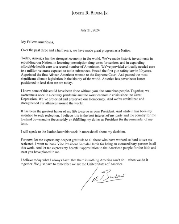 바이든 대통령은 자신의 소셜 미디어인 X(구 트위터)를 통해 민주당 대선 후보직에서 물러난다는 성명을 발표했습니다. 그는 "재선 도전이 내 의도였으나, 남은 임기 동안 대통령으로서의 의무를 다하는 것이 당과 국가에 최선의 이익이라고 믿는다"고 말했습니다. 또한 "내 결정에 대해 금주 후반에 더 구체적으로 국민들에게 설명할 것"이라고 덧붙였습니다. 바이든 대통령의 사퇴로 인해 민주당은 새로운 후보를 선출해야 하는 상황에 직면했습니다.