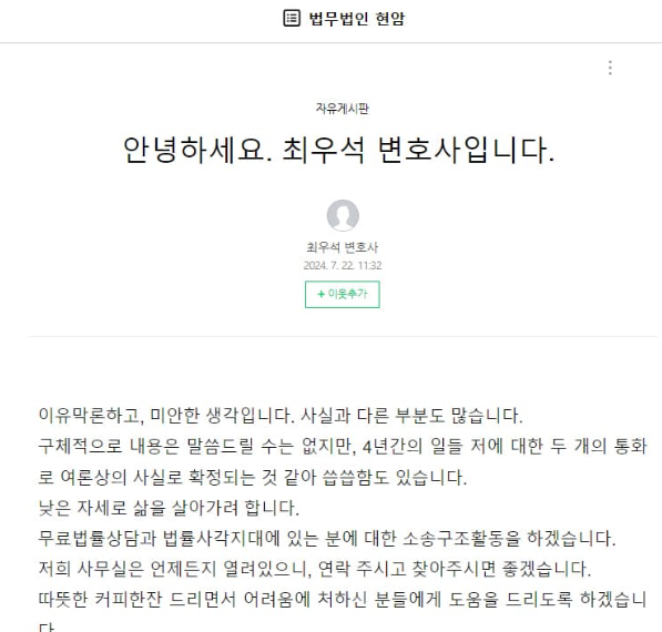 최 변호사는 쯔양의 전 소속사 대표이자 전 남자친구였던 A씨의 대리인으로, A씨로부터 들은 쯔양에 관한 정보를 유출했다는 의혹을 받고 있습니다. 최우석 변호사는 자신의 블로그를 통해 입장을 밝혔습니다. 그는 "이유를 막론하고 미안한 생각이 든다"며 사과하면서도, 사실과 다른 부분이 많다고 주장했습니다.