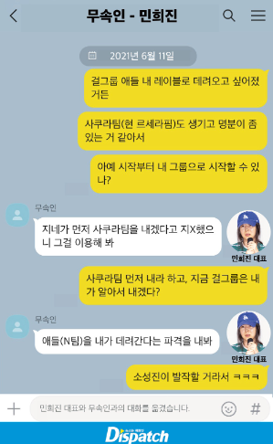 디스패치에서는 민희진 대표가 쏘스뮤직 소속 연습생이었던 뉴진스 멤버들을 자신의 레이블에서 데뷔시키기 위해 강탈했다는 보도가 있었습니다.