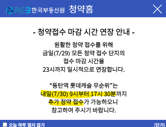 이번 청약의 모집공고는 7월 22일에 올라왔습니다. 원래 접수일은 오는 15시 30분까지였으나, 사이트 접속 오류로 인해 청약 시간을 밤 11시까지 연장했습니다. 동탄역 롯데캐슬 무순위 청약 접수일은 다음날인 30일까지이며, 마감 시간 연장은 29일 오후 11시까지 한정됩니다.