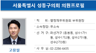 고 의원님은 성동구 라선거구(응봉동, 성수1가1동, 성수1가2동, 성수2가1동, 성수2가3동)에서 주민들을 대표하고 있습니다.