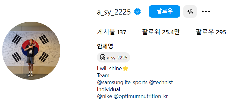 그녀의 계정은 @a_sy_2225로, 약 25만 명의 팔로워를 보유하고 있습니다. 그녀는 훈련 장면, 경기 모습, 그리고 일상 생활을 공유하며 팬들과 소통하고 있습니다.