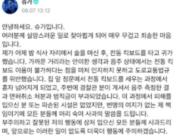 슈가는 이 사건에 대해 팬 플랫폼 위버스를 통해 사과문을 올렸습니다. 그는 "짧은 거리라고 생각했지만, 음주 상태에서 전동 킥보드를 운전하는 것이 불법이라는 사실을 인지하지 못했다"며 팬들에게 실망을 안겨드려 죄송하다는 마음을 전했습니다. 또한, 앞으로 이런 일이 다시는 발생하지 않도록 주의하겠다고 다짐했습니다.