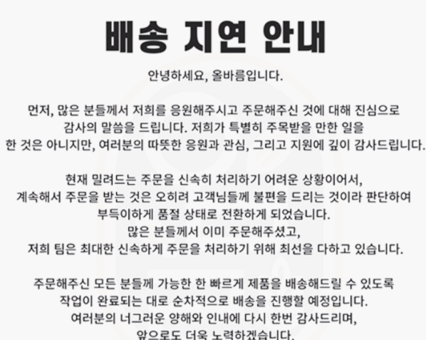 올바름 쌀과자의 사연이 알려지자, 많은 이들이 이 회사를 응원하기 위해 제품을 구매하기 시작했습니다. 이로 인해 주문이 폭주하게 되었고, 현재 배송이 다소 지연되고 있는 상황이라고 합니다. 하지만, 김 대표님과 팀원들은 최선을 다해 작업을 진행하고 있으며, 가능한 한 빠르게 제품을 고객들에게 배송하려고 노력하고 있습니다.