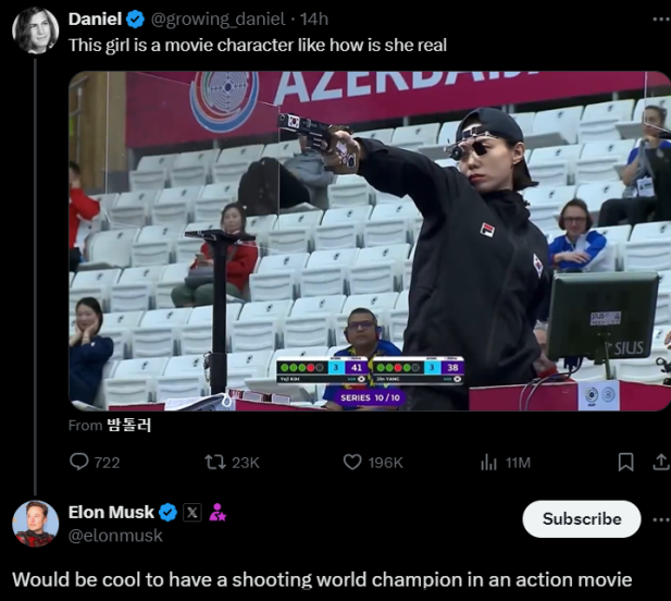 김예지 선수의 인기는 스포츠계에만 머무르지 않았습니다. 테슬라의 최고경영자이자 X(구 트위터)의 소유주인 일론 머스크도 그녀에게 관심을 표명했죠. 머스크는 자신의 X 계정에 “김예지 선수가 액션 영화에 출연한다면 정말 멋질 것 같다.