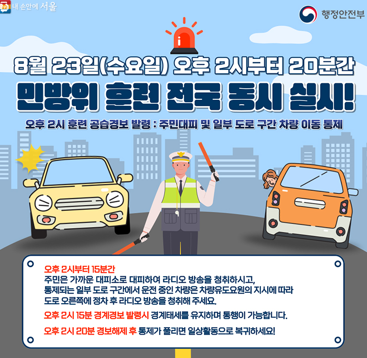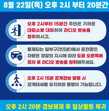 그리고 마지막 날인 8월 22일에는 전 국민이 참여하는 공습 대비 민방위 훈련이 진행됩니다. 이날 오후 2시부터 20분간 진행되는 공습 대비 민방위 훈련에서는 사이렌 소리에 따라 대피소로 이동하는 것이 핵심입니다. 사이렌이 울리면 1분 동안 공습 경보가 발령되며, 이후 15분간 경계 경보가 이어지고, 마지막 5분간은 경보가 해제됩니다.