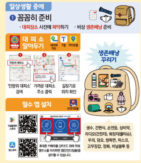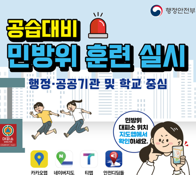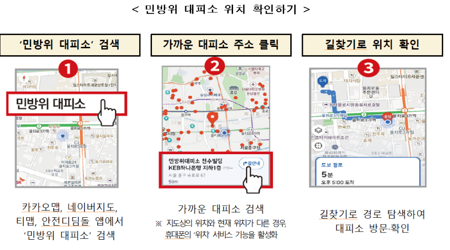 공습 대비 민방위 훈련에서 중요한 요소 중 하나는 민방위 대피소입니다. 전국에는 약 1만 7천 개의 대피소가 지정되어 있으며, 아파트 지하, 지하철역, 지하상가 등이 그 예입니다. 대피소의 위치는 네이버, 카카오, 티맵, 국민재난안전포털, 안전디딤돌 앱 등을 통해 쉽게 확인할 수 있으니, 훈련 전 미리 가까운 대피소를 찾아두시면 좋겠습니다.