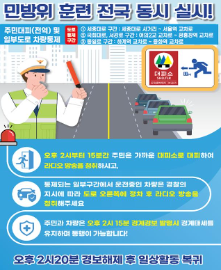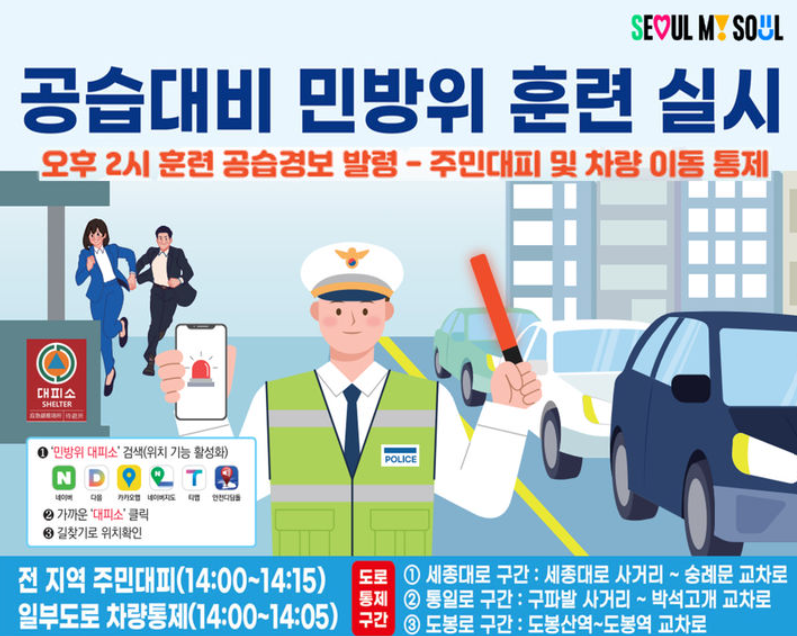이 과정에서 시민들은 가까운 민방위 대피소나 안전한 지하 공간으로 대피해야 하며, 이후 경계 경보 발령 시 대피소에서 나와 경계 태세를 유지하면서 일상으로 복귀할 수 있습니다. 이번 공습 대비 민방위 훈련 중에는 일부 도로 구간에서 차량 이동 통제가 이루어질 예정입니다. 특히 서울의 경우, 세종대로, 통일로, 도봉로 등 주요 도로에서 오후 2시부터 2시 5분까지 차량 통제가 진행됩니다.