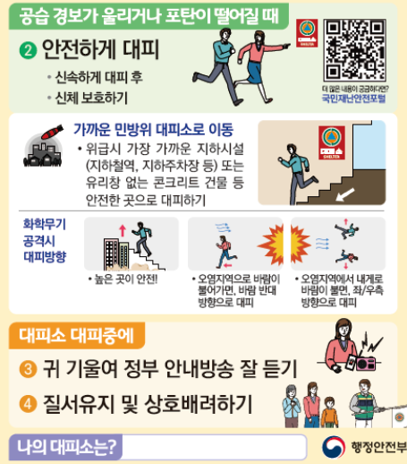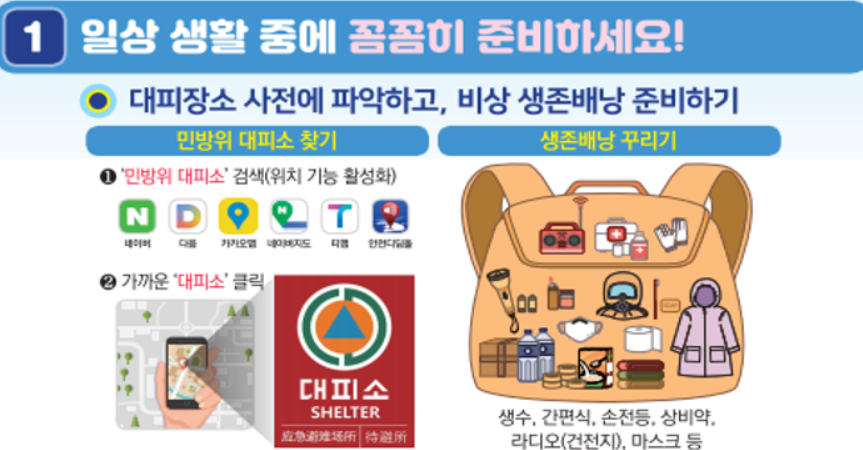 공습 대비 민방위 훈련에서 중요한 요소 중 하나는 민방위 대피소입니다. 전국에는 약 1만 7천 개의 대피소가 지정되어 있으며, 아파트 지하, 지하철역, 지하상가 등이 그 예입니다. 대피소의 위치는 네이버, 카카오, 티맵, 국민재난안전포털, 안전디딤돌 앱 등을 통해 쉽게 확인할 수 있으니, 훈련 전 미리 가까운 대피소를 찾아두시면 좋겠습니다.