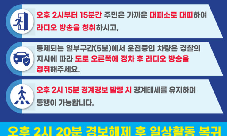 그리고 마지막 날인 8월 22일에는 전 국민이 참여하는 공습 대비 민방위 훈련이 진행됩니다. 이날 오후 2시부터 20분간 진행되는 공습 대비 민방위 훈련에서는 사이렌 소리에 따라 대피소로 이동하는 것이 핵심입니다. 사이렌이 울리면 1분 동안 공습 경보가 발령되며, 이후 15분간 경계 경보가 이어지고, 마지막 5분간은 경보가 해제됩니다.