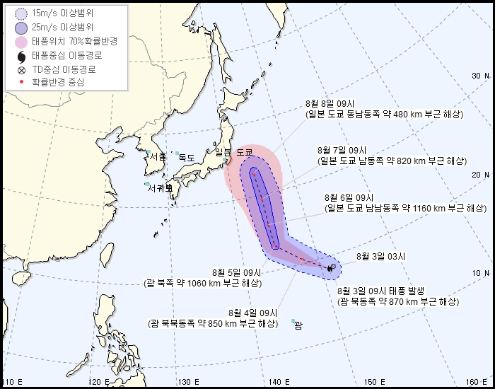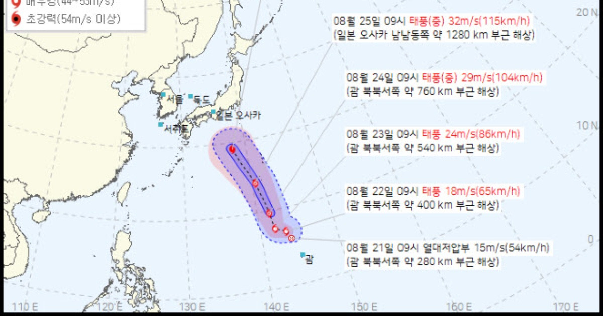 21일 오전 9시경 괌 북서쪽 해역에서 발생한 열대저압부는 현재 시속 15m의 강풍을 동반하며 북북서로 이동하고 있습니다. 기상청에 따르면 이 열대저압부는 24시간 이내에 태풍으로 발달할 가능성이 높으며, 오는 25일경에는 '강'등급의 태풍으로 성장할 가능성이 크다고 합니다. 26일경에는 일본 오사카 남남동쪽 약 580km 부근 해상까지 접근할 것으로 예상되고 있습니다.