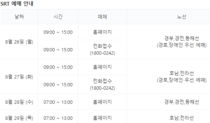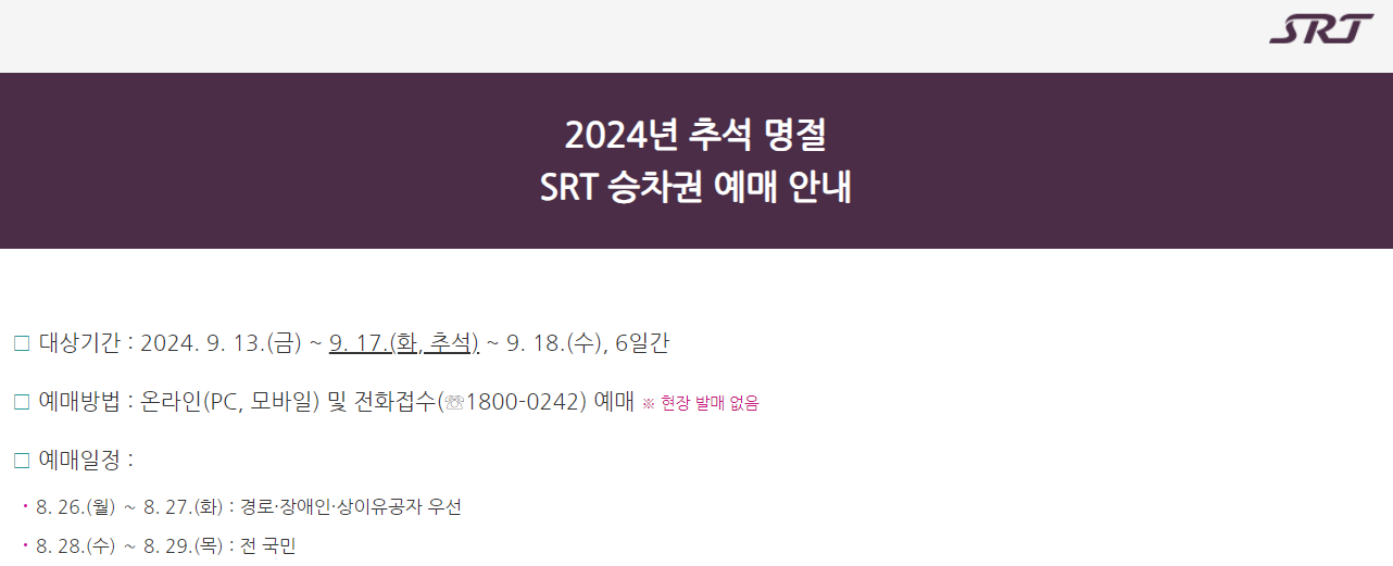 SRT 추석 기차표 예매는 2024년 8월 26일 월요일부터 29일 목요일까지 4일간 진행되었습니다. SRT의 경우도 KTX와 마찬가지로 처음 2일 동안은 경로자, 장애인 등 정보화 취약 계층을 대상으로 우선 예매가 진행되었고, 뒤의 2일 동안 일반 고객을 대상으로 한 예매가 진행되었습니다. 일반 고객의 경우 PC와 모바일을 통해서만 예매가 가능했습니다.