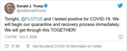 트럼프 대통령이 트위터로 10월 2일 오늘. 멜라니아 트럼프(영부인)와 함께 도널드 트럼프 본인이 코로나 감염증(Covid 19)에 양성판정을 받았다고 올렸습니다.