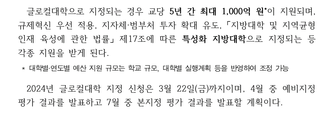 글로컬대학 프로젝트는 단순히 몇 년간의 지원을 통해 끝나는 사업이 아닙니다. 이 프로젝트는 지역과 대학이 지속적으로 성장할 수 있는 기반을 마련하고, 이를 통해 장기적인 성과를 창출하는 것을 목표로 하고 있습니다.