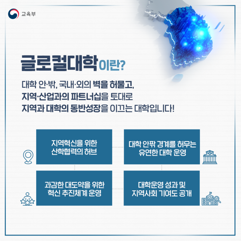 글로컬대학은 단순한 교육기관이 아닙니다. 이 프로젝트는 대학이 지역사회와 산업계와 협력하여, 함께 성장할 수 있는 혁신적인 모델을 개발하고 적용하는 것을 목표로 합니다.