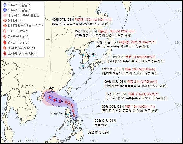 태풍의 경로는 늘 예측이 어렵지만, 현재로서는 태풍 야기가 필리핀을 지나 타이완 동쪽 해상으로 북상할 가능성이 큽니다. 이 과정에서 태풍은 중심기압 990 헥토파스칼(hPa), 최대 풍속 초속 24m(시속 86㎞)에 이르는 강풍을 동반한 채로 타이완 남쪽 해상을 거쳐갈 것으로 보입니다.