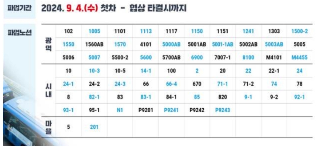 - 지역 주민들이 주로 이용하는 마을버스도 일부 파업에 참여할 것으로 예상됩니다. 이는 특히 교외 지역이나 대중교통이 비교적 부족한 지역에서 큰 영향을 미칠 수 있습니다.