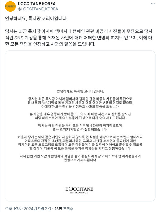 록시땅코리아는 사건의 재발 방지를 위해 내부 관리 시스템과 보안 체계를 강화할 계획이라고 덧붙였습니다. 또한, 민규와 팬들에게 사과의 뜻을 전하며, 이번 사건의 책임을 통감하고 향후 유사 사건 방지를 위해 최선을 다할 것이라고 강조했습니다.