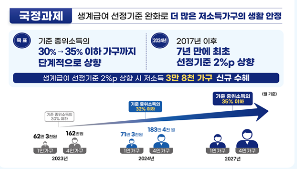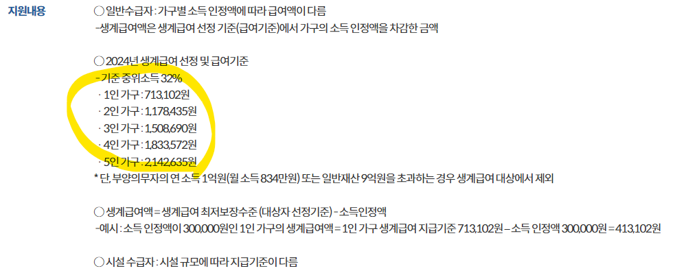생계급여는 중위소득의 일정 비율을 기준으로 지급되며, 2024년 기준으로 1인 가구는 약 71만 원 정도의 금액을 받게 됩니다. 이는 소득인정액을 제외한 금액으로, 실제로는 수급자의 소득에 따라 차등 지급됩니다.