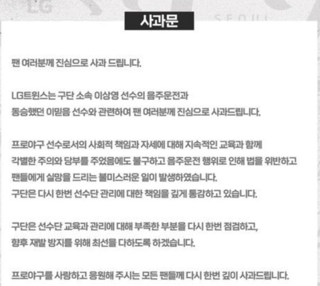 LG 트윈스는 이번 사건과 관련해 빠르게 공식 사과문을 발표했습니다. 구단은 사과문에서 "팬 여러분께 진심으로 사과드린다"며, 이상영과 이믿음 두 선수의 음주운전 사실을 인정했습니다. 또한, 구단은 이 사건을 KBO 클린 베이스볼 센터에 신고했으며, 향후 상벌위원회의 징계 결과를 겸허히 수용하겠다는 입장을 밝혔습니다.