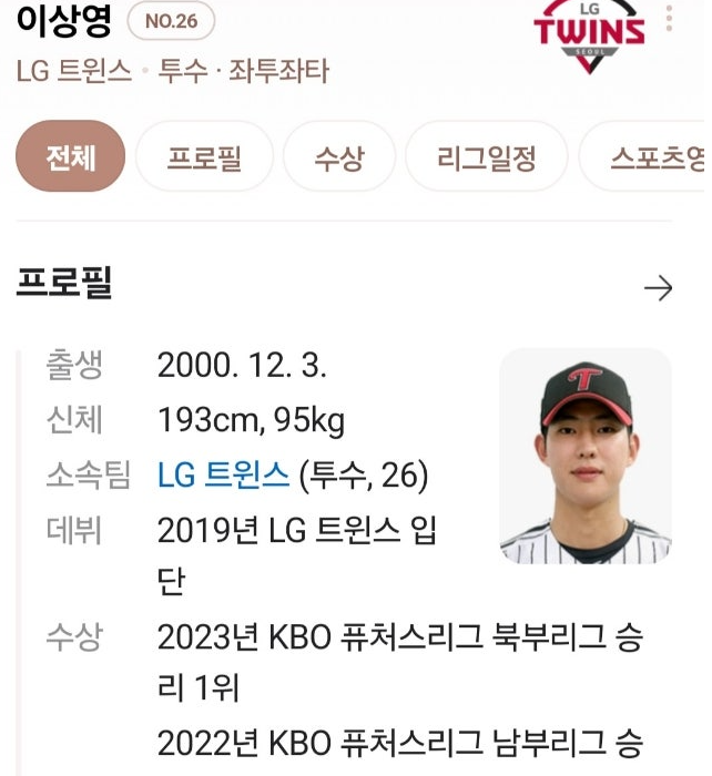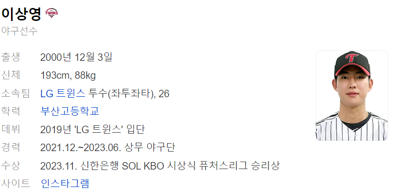 이상영 선수는 2000년 부산에서 태어나 올해로 23살입니다. 그는 부산수용초, 개성중, 부산고를 졸업한 뒤 2019년 KBO 신인 드래프트에서 2차 1라운드 5순위로 LG 트윈스에 입단하며 많은 기대를 받았습니다. 당시 계약금은 1억 5천만 원으로, 좌완 유망주로 평가받았던 선수였습니다. 특히 큰 키(194cm)와 좋은 신체 조건을 바탕으로 장기적인 성장이 기대되었으며, LG 트윈스의 차세대 선발 투수로 준비 중이었습니다.