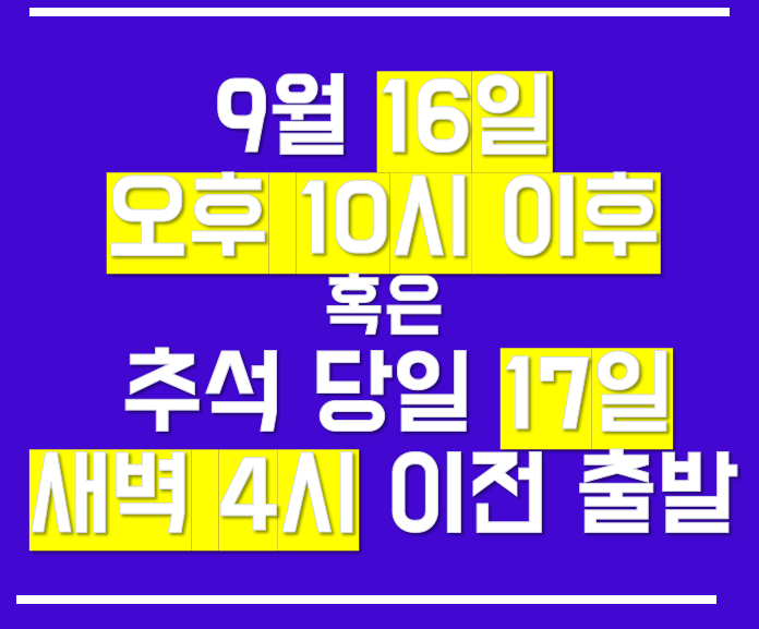 가능하시다면 9월 16일 오후 10시 이후나 추석 당일인 17일 새벽 4시 이전에 출발하시는 것을 추천드립니다. 저도 예전에 이렇게 출발해서 비교적 수월하게 고향에 도착했던 기억이 있거든요.